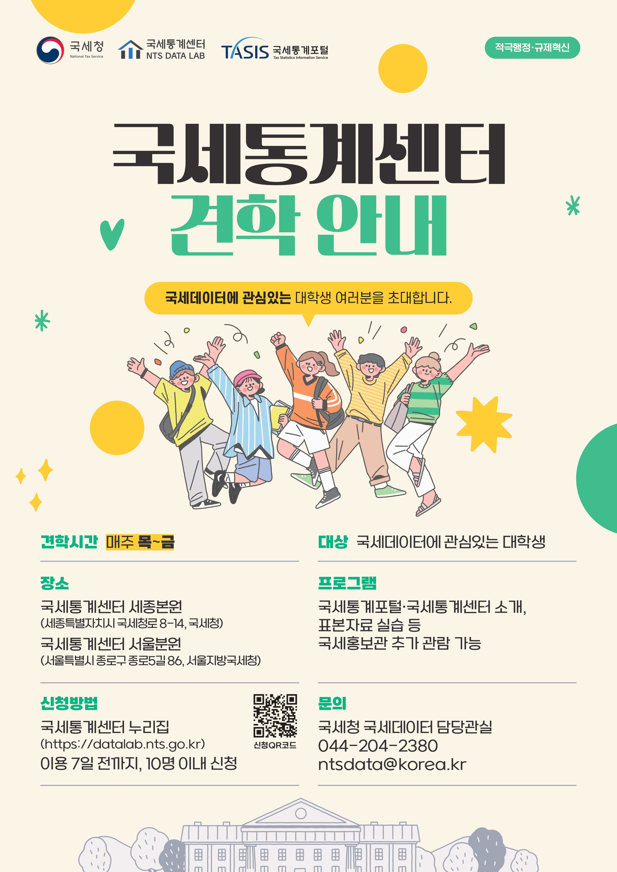 「국세통계센터 대학생 견학 프로그램」을 운영하고 있습니다. 국제데이터에 관심 있는 학생들은 많은 참여바랍니다.