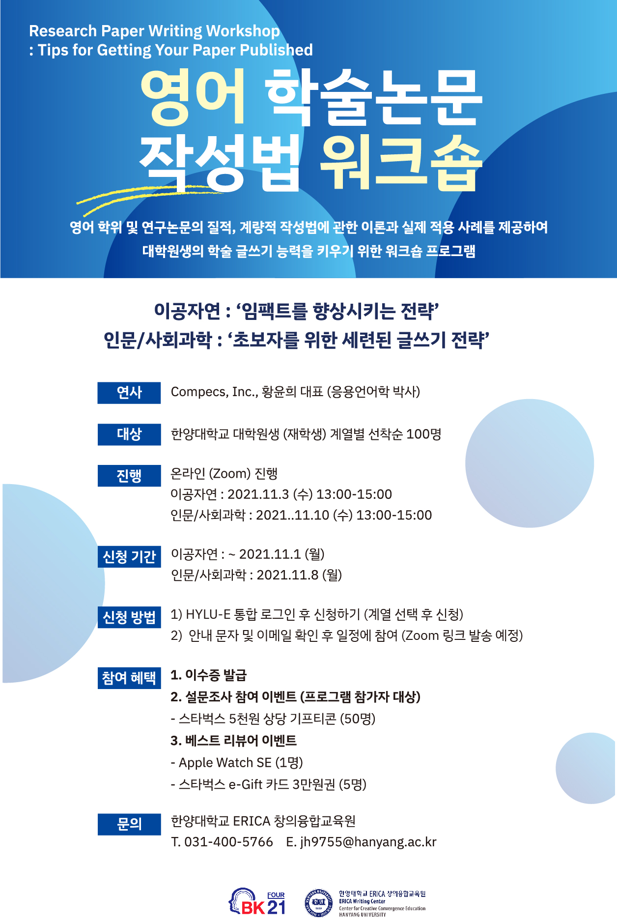 1. 창의융합교육팀에서는 대학원생의 학술 글쓰기 능력 향상을 위한 BK21사업 ‘영어 학술논문 작성법 워크숍’ 프로그램을 진행하고자 합니다.