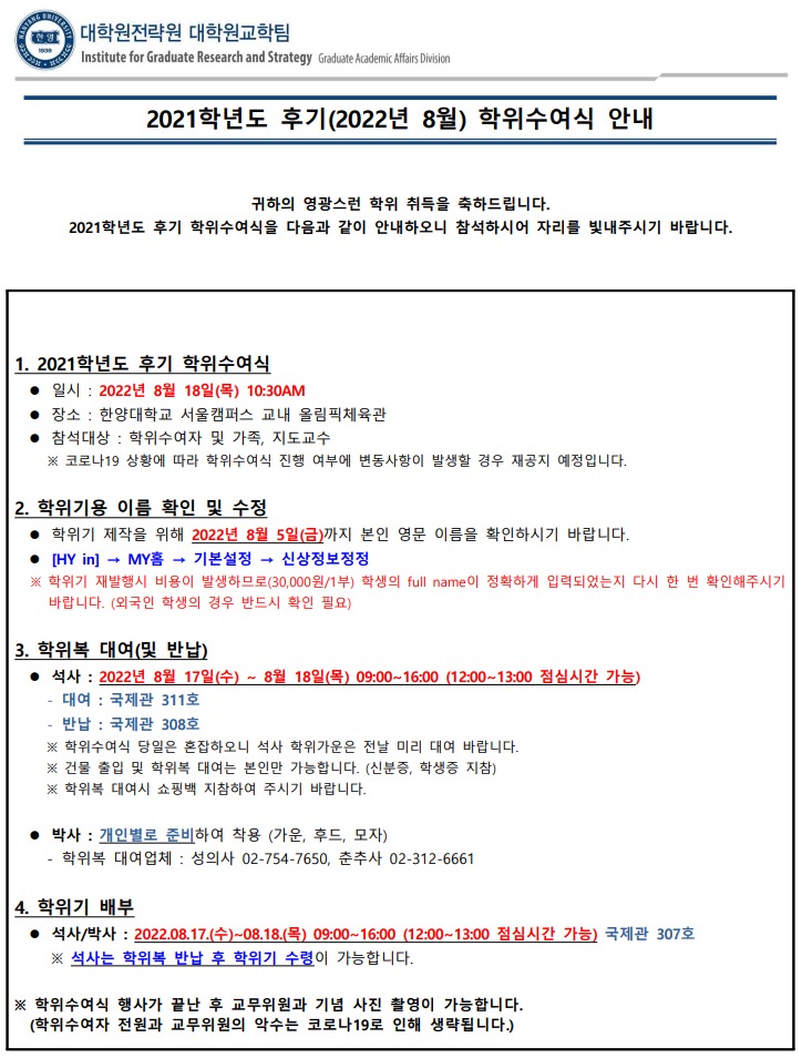 [학사공지] 2021학년도 후기(2022년 8월) 대학원 학위수여식 안내