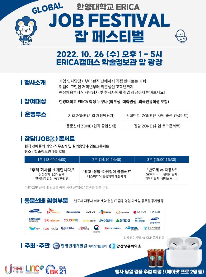 [한양인재개발원] 2022학년도 ERICA 잡페스티벌 개최 행사(10. 26(수))