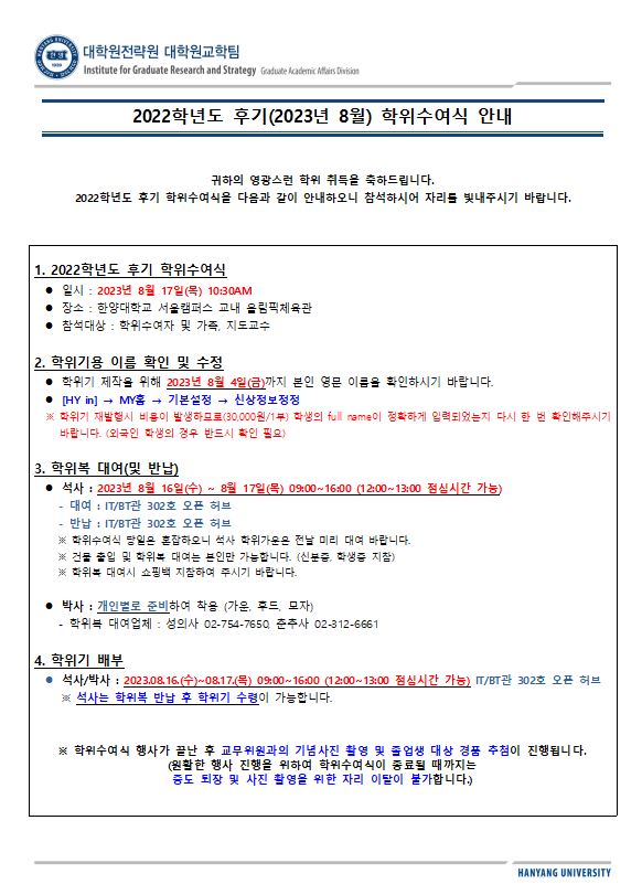[학사공지] 2022학년도 후기(2023년 8월) 대학원 학위수여식 안내