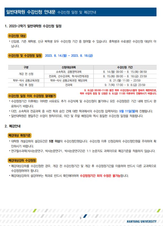 2. 수강신청 및 수강정정 일정 : 2023. 8. 14.(월) ~ 2023. 8. 18.(금)