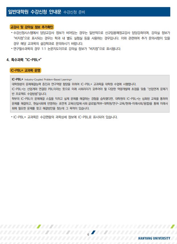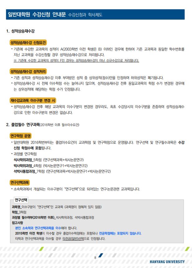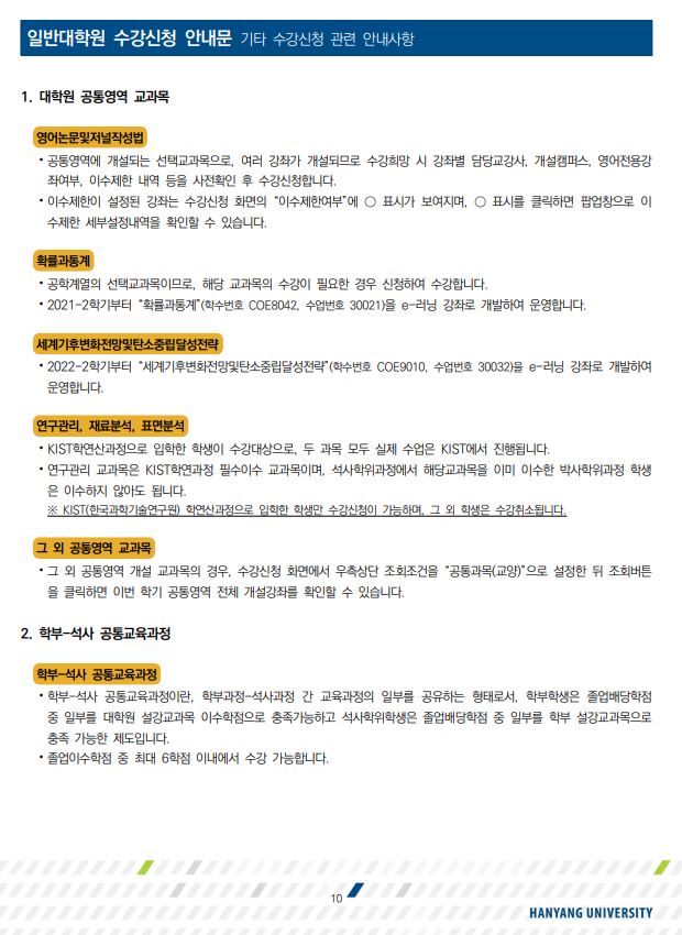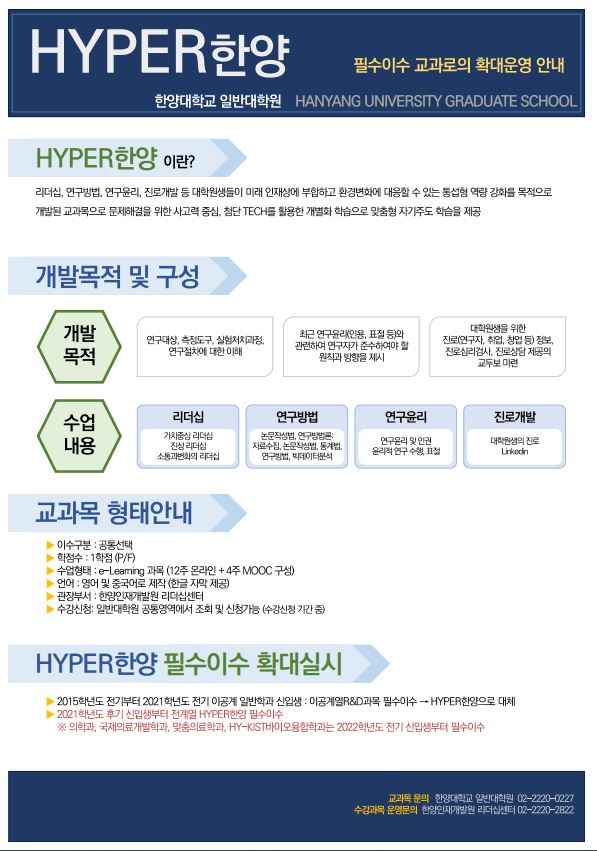 • 이공계열 R&D과목변경(이공계필수과목) : 2020-2학기부터 ‘글로벌과학기술인을위한연구,안전,윤리입문’에서 ‘HYPER한양’으로 대체됩니다.