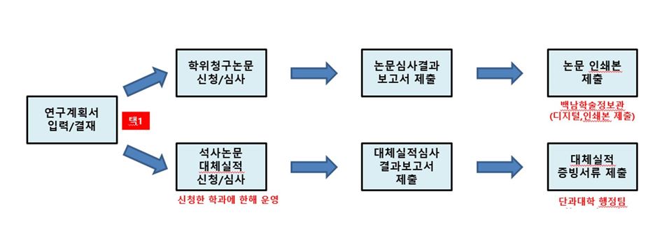 ※ 박사과정 학생 및 2018학번 석사과정 입학생까지는 학위청구논문 대체제도 적용 불가, 신청하지 않은 학과는 추가 신청 후 시행 가능