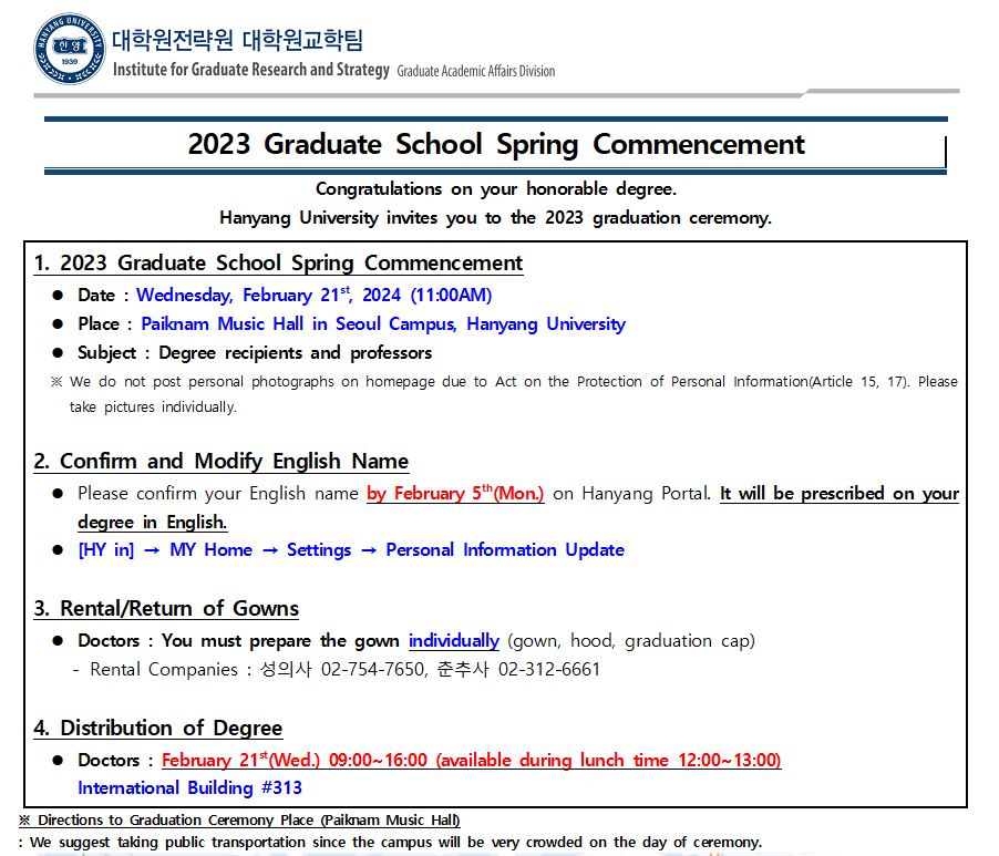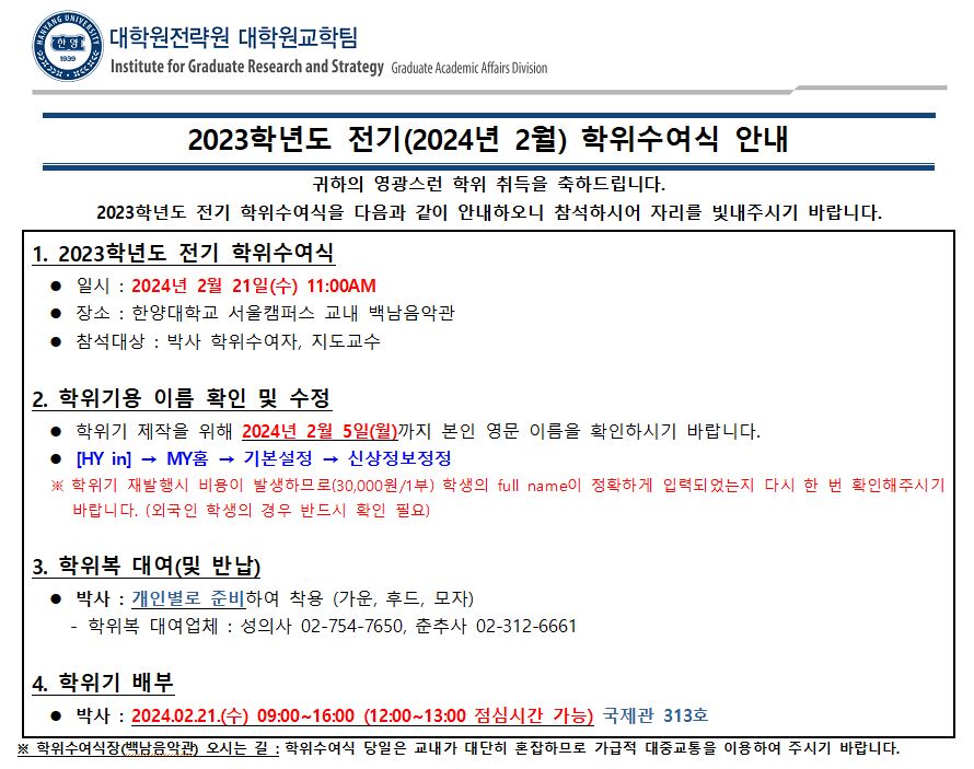 [학사공지] 2023학년도 전기(2024년 2월) 대학원 학위수여식(박사) 안내