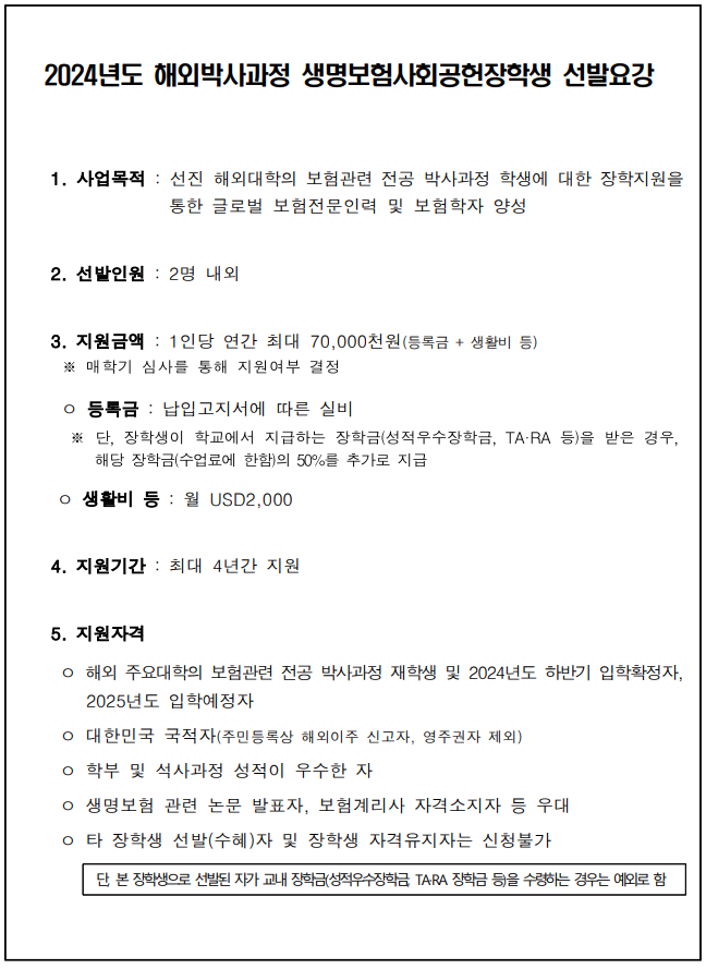 2024년도 해외박사과정 생명보험사회공헌 장학생 선발