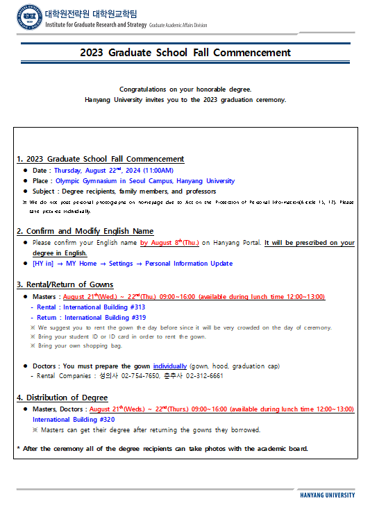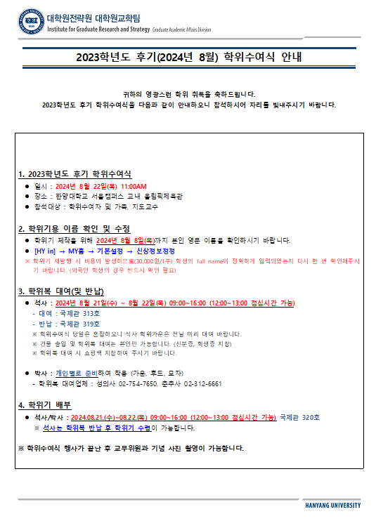 2023학년도 후기 학위수여식을 다음과 같이 진행합니다.