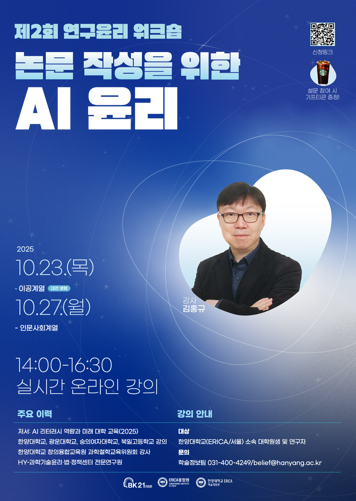 1 | 논문 작성을 위한 AI 윤리 | 이공계열 | 10/23(목) | 14:00 - 16:30 | 하이브리드 (대면+비대면) |