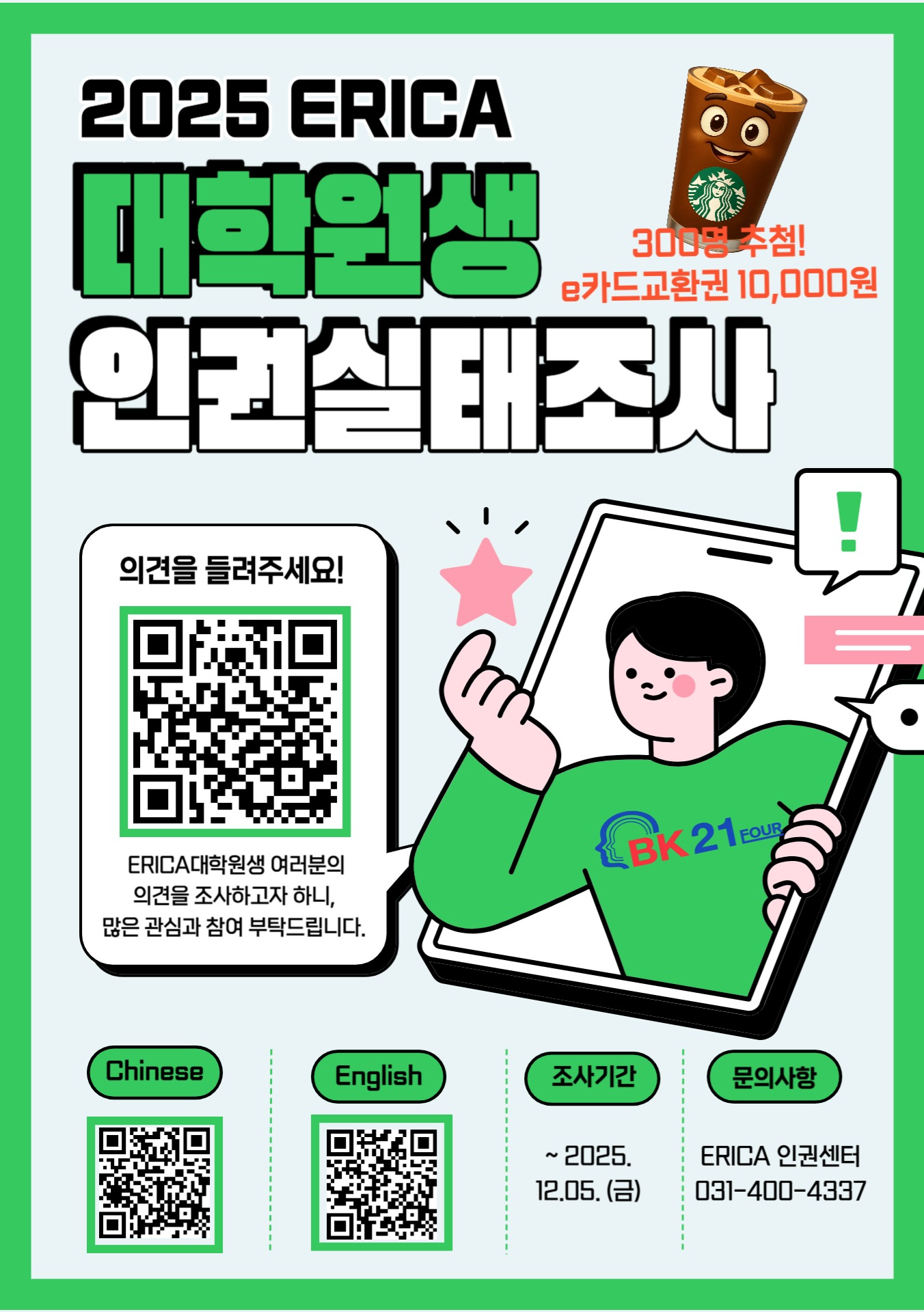 ERICA 인권센터에서는 모두가 안전한 캠퍼스 문화를 만들어가기 위해 <2025년도 ERICA 대학원생 인권 실태조사>를 실시하오니 많은 관심과 참여 부탁드립니다.