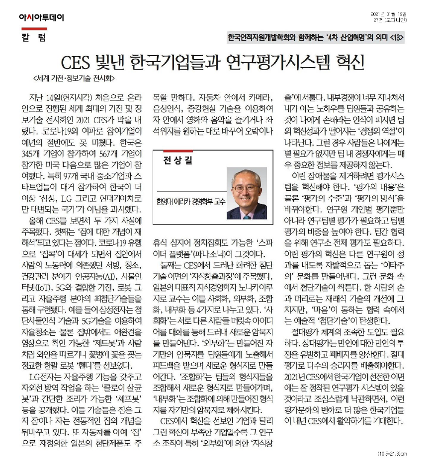 [칼럼]CES 빛낸 한국기업들과 연구평가시스템 혁신(경영학부 전상길 교수님)