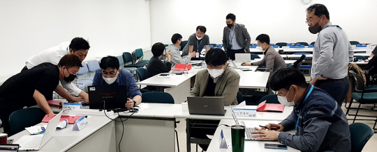 ▲ 경기도 수원시 파크시스템 본사 대회의실에서 원자현미경을 제조하는 글로벌 강소기업인 ‘파크시스템스’의 팀장급 이상 직원들이 학교의 ‘Park Mini MBA 과정’에 참여해 신제품 마케팅 전략 등 회사가 당면한 과제에 대해 조별 토론을 벌이고 있다. 한양대 제공