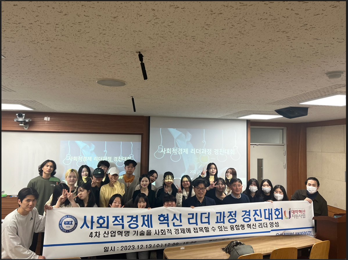 제 2차 사회적 경제 혁신리더 과정이 2023년 9월에 시작하여 12월에 성공적으로 마무리를 하였습니다. 2023년 12월 13일 한창희 경상대 학장님과 본 과정의 주임교수인 서환주 교수님을 모시고 사회적 경제 혁신리더 과정의 경진대회와 시상식이 진행되었습니다. 전체 24명이 수료 하였으며 경진대회는 4차 산업혁명기술을 사회적 경제에 어떻게 접목할 수 있는가에 대한 주제를 중심으로 진행되었습니다. 대상 1팀, 최우수상 2팀, 장려상 5팀이 선정되었습니다. 대상은 “AI기술을 활용한 사회적 경제 사업아이디어“를 발표한 김지웅(경영학부 21학번), 박주현(경제학부 21학번) 그리고 박유진(한국언어학부 21학번)이 선정되었고 상장과 70만원의 상금을 수여했습니다.