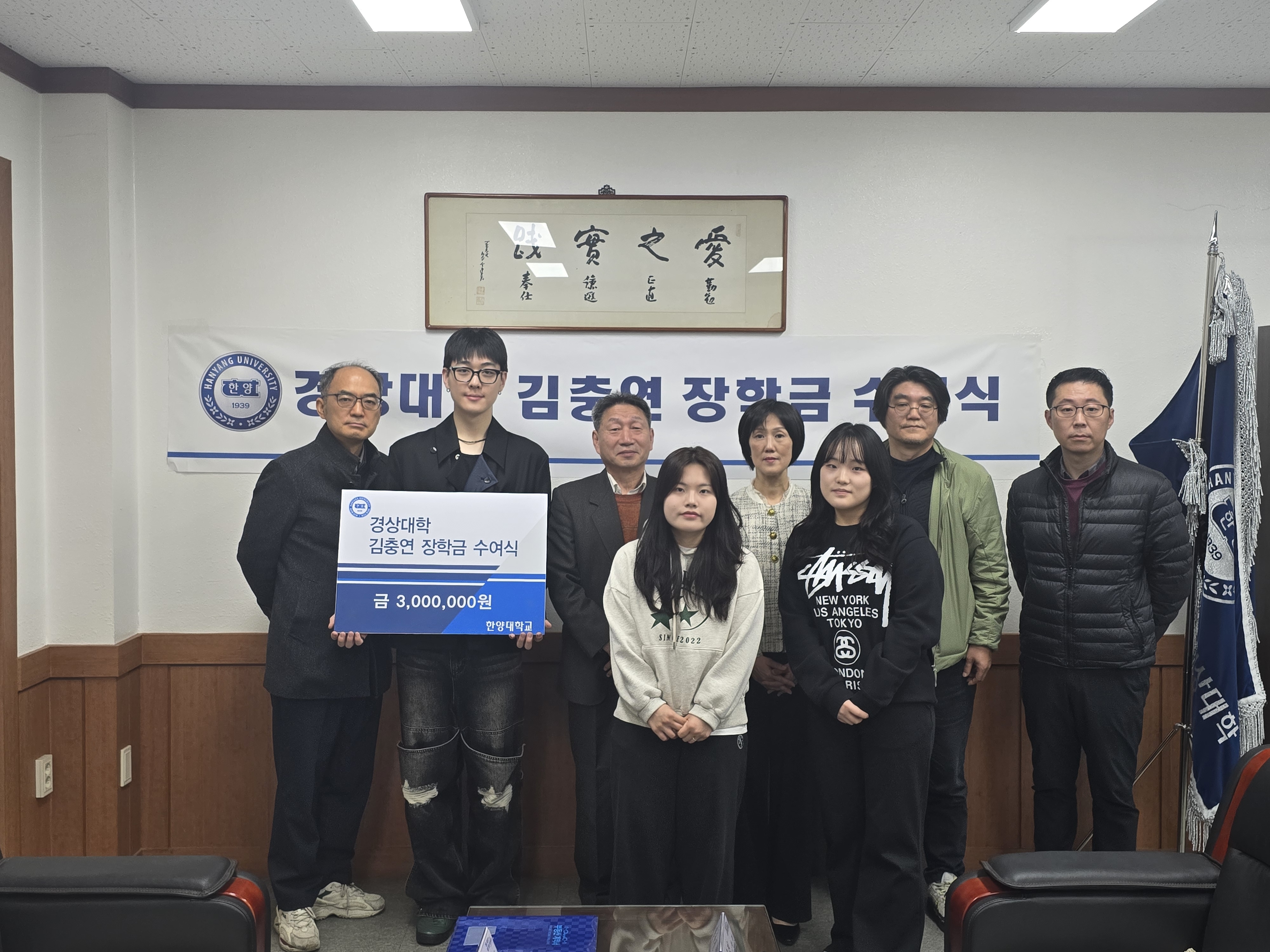기부자의 뜻에 따라 경제학부 및 경영학부 학생 3명을 선발하여 각 100만 원씩, 총 300만 원의 장학금을 수여하였습니다.