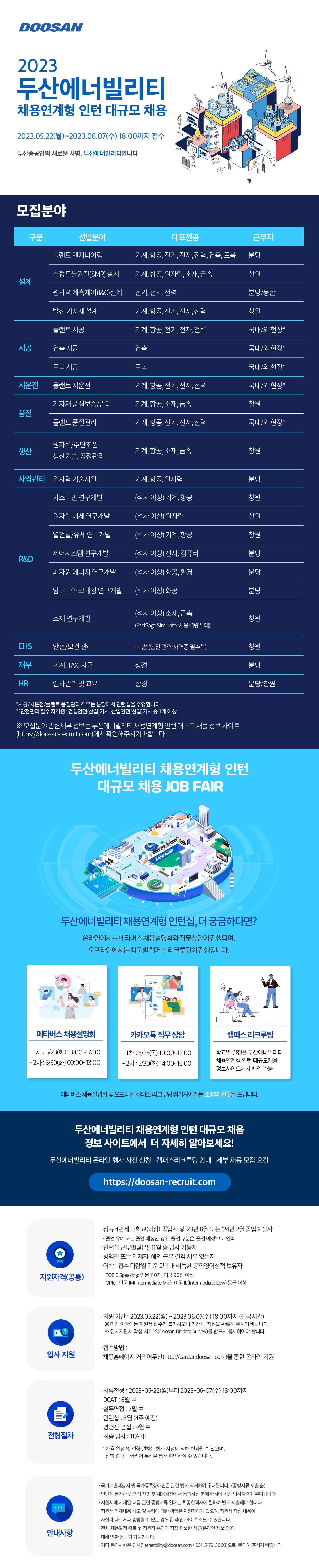 두산에너빌리티 채용연계형 인턴 대규모 채용 정보 사이트에서 더 자세히 알아보세요! 두산에너빌리티 온라인 행사 사전 신청 · 캠퍼스리크루팅 안내 · 세부 채용모집 요강