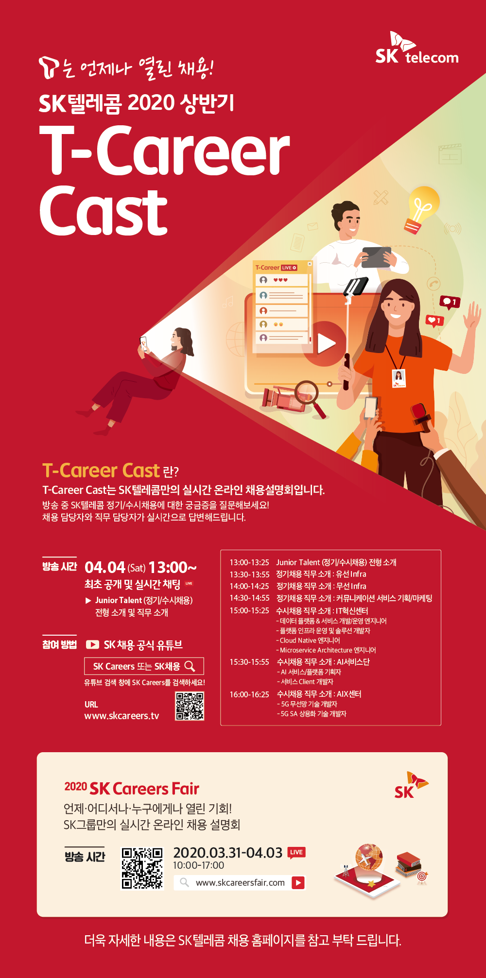 T-Career Cast라는 실시간 온라인 채용 설명회를 통해 많은 지원자 학생분들께 다양하고 정확한 SK텔레콤의 채용 정보를 전달 드리고자 합니다.