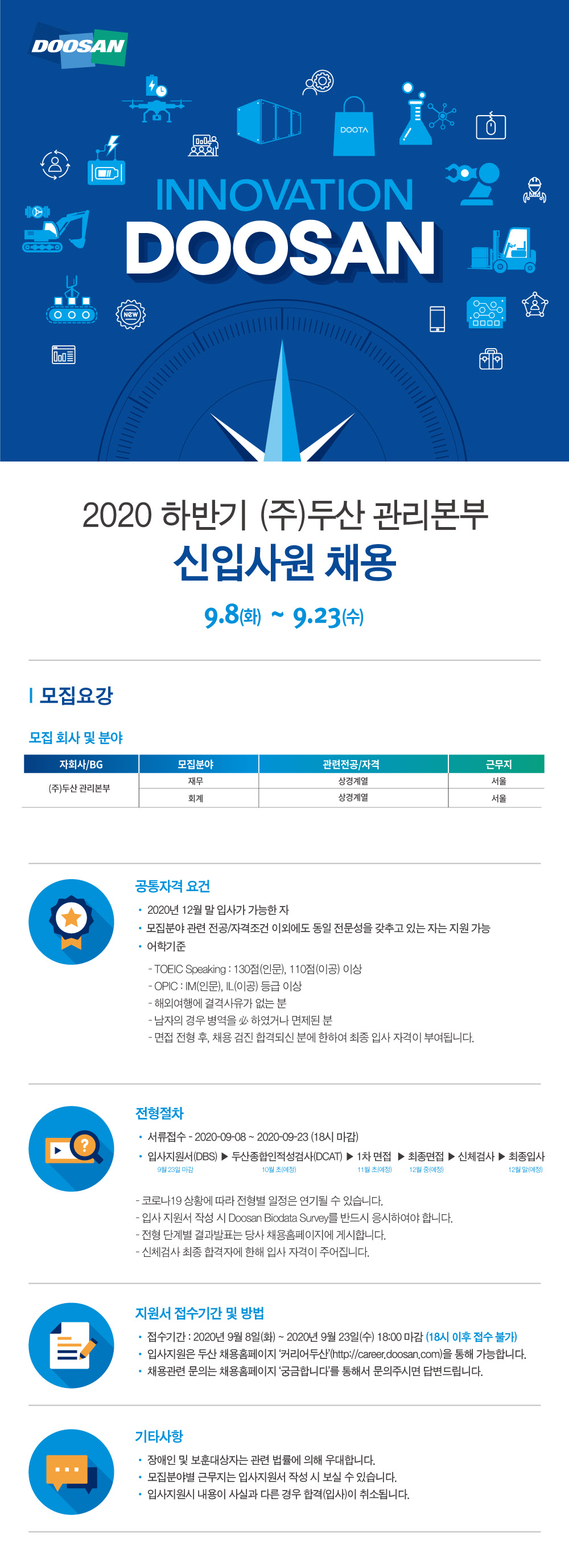 (주)두산 관리본부에서 2020 하반기 신입사원 채용을 진행합니다.