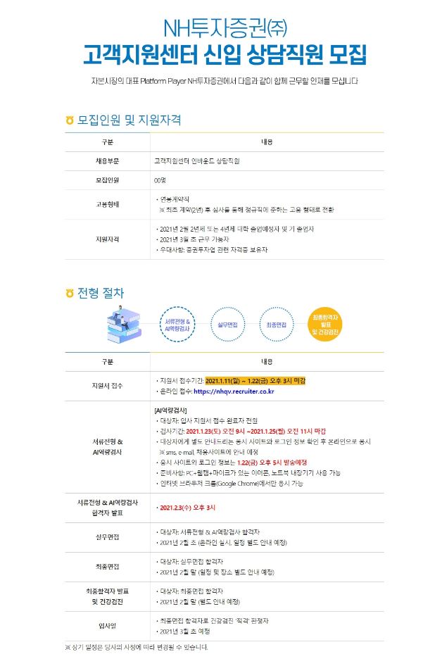 [NH투자증권] 고객지원센터 신입 상담직원 모집 공지 안내합니다.
