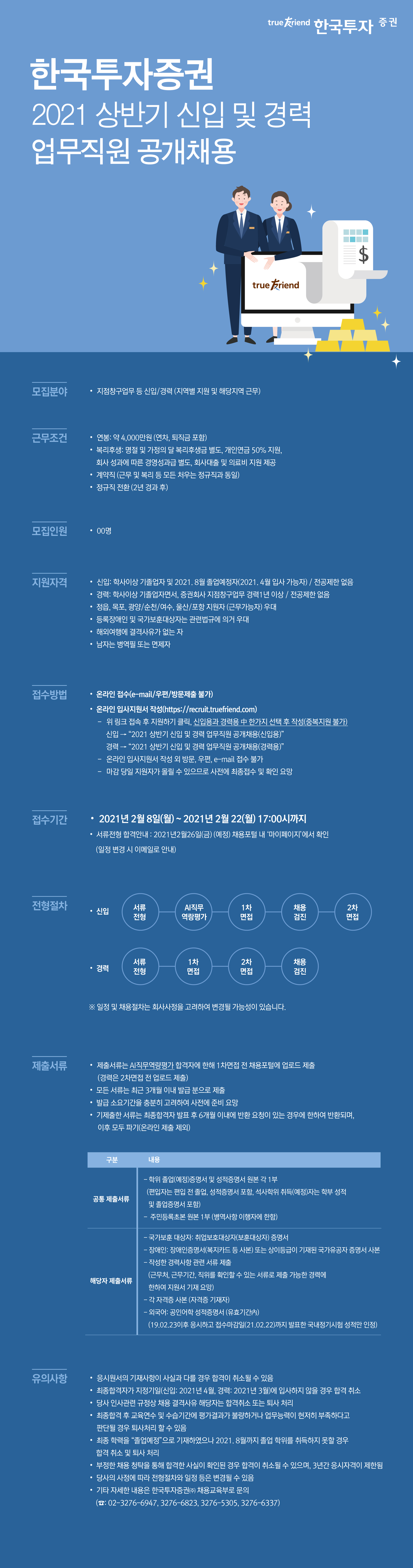 - 경력 : 학사이상 기졸업자면서, 증권회사 지점창구업무 경력 1년 이상 / 2021.3월 입사 가능자