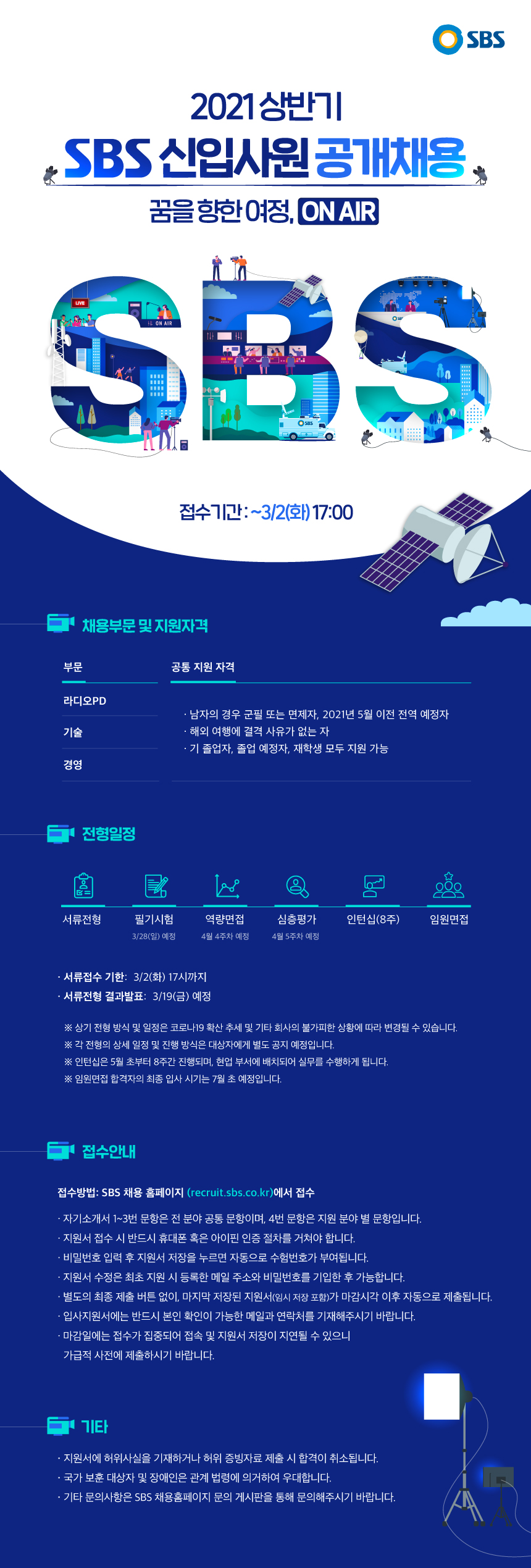 • 기타 문의사항은 SBS 채용홈페이지 문의 게시판을 통해 문의해주시기 바랍니다.