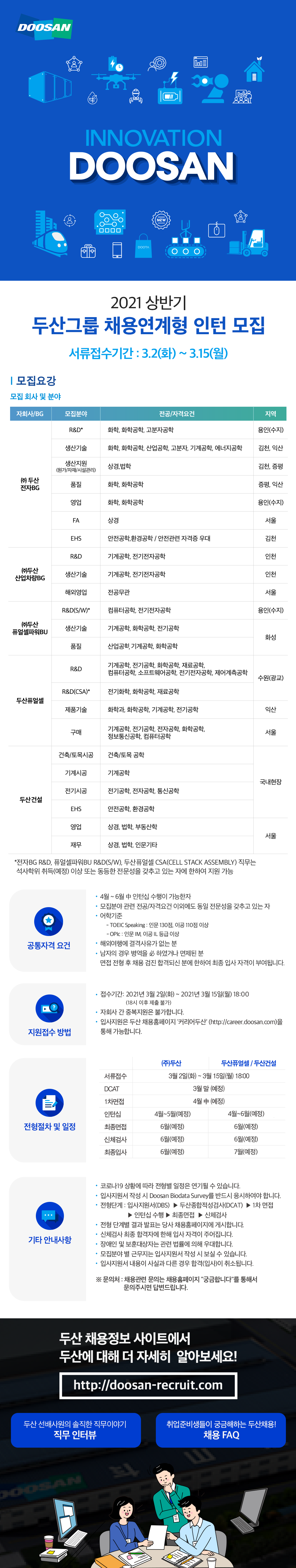 4. 인턴십 : 4월~5월(예정) ※ 두산퓨얼셀/두산건설 : 4월~6월(예정)