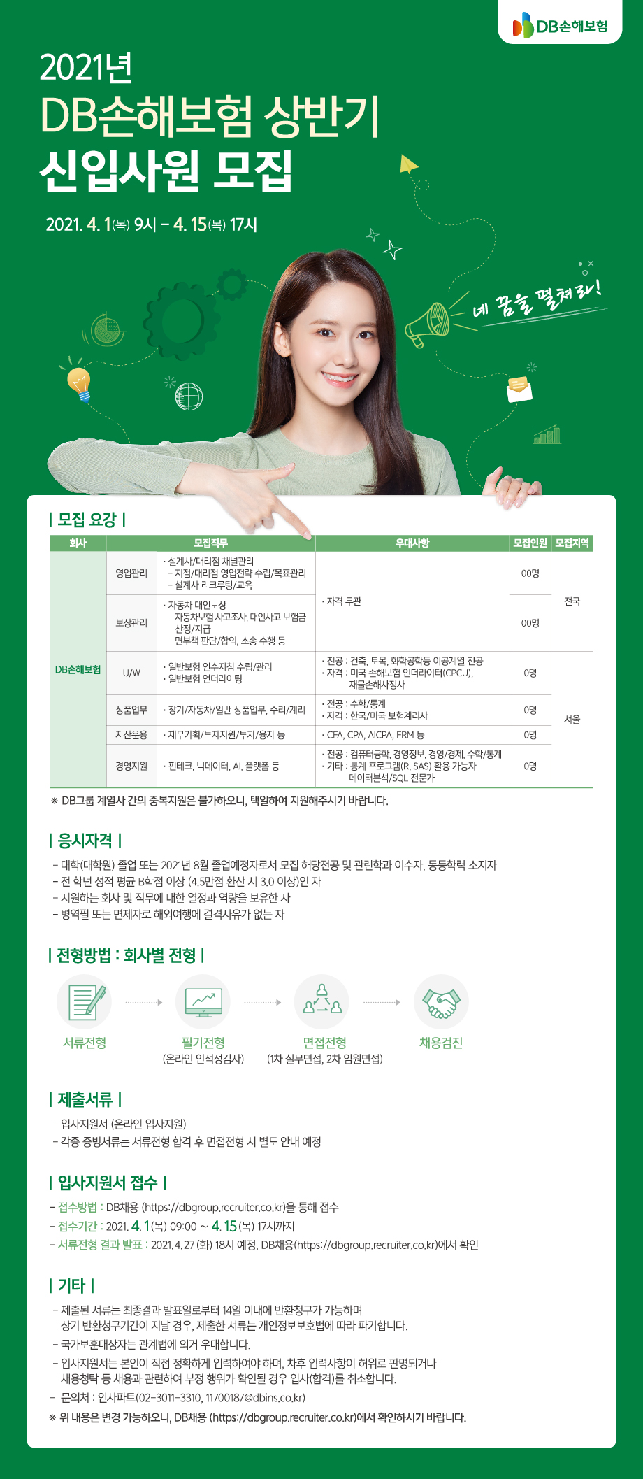 - 서류전형 결과 발표 : 2021.04.27(화) 18시 예정, DB채용(https://dbgroup.recruiter.co.kr)에서 확인
