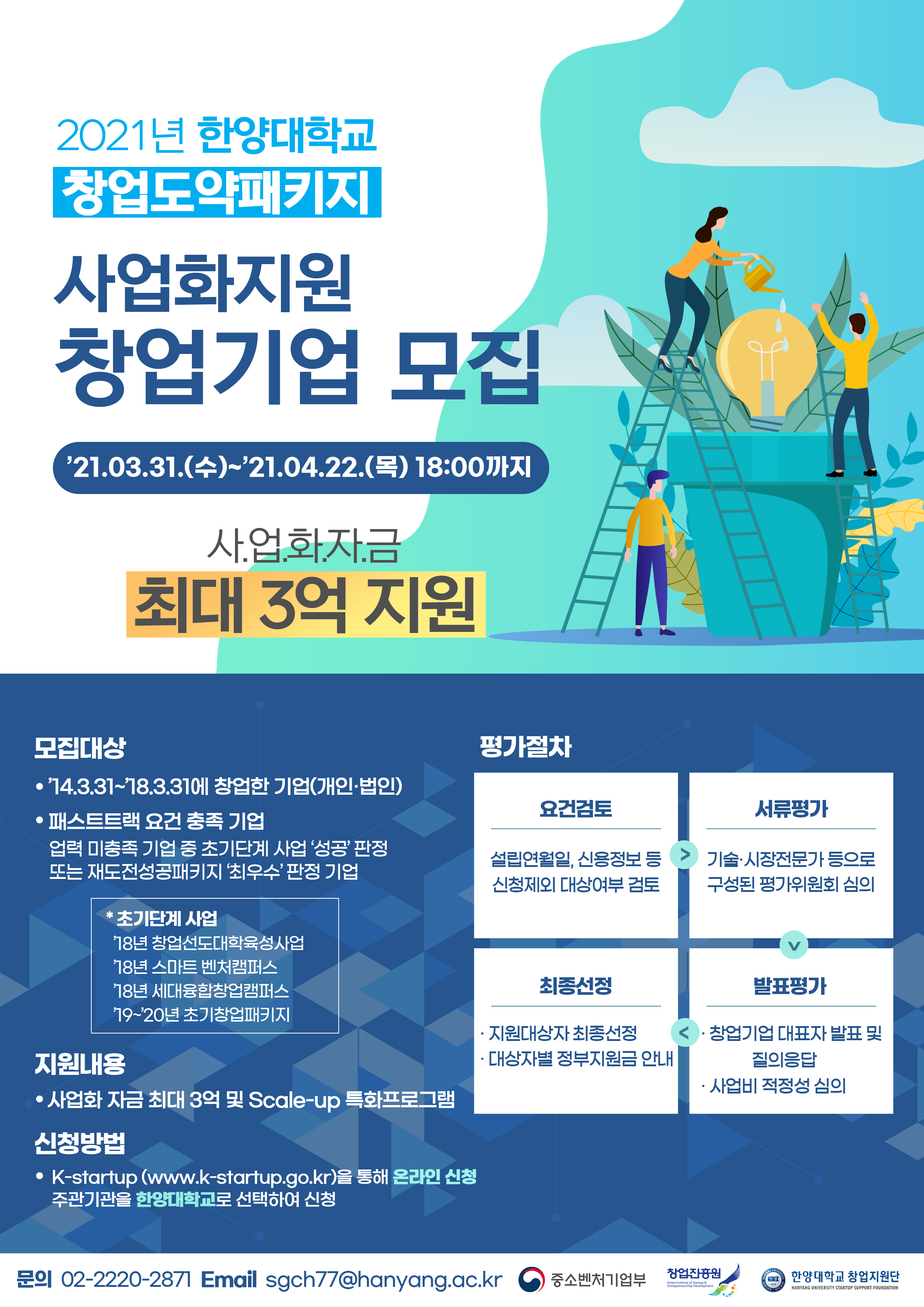 2021년 한양대학교 창업도약패키지 사업화지원 창업기업 모집 공고 안내