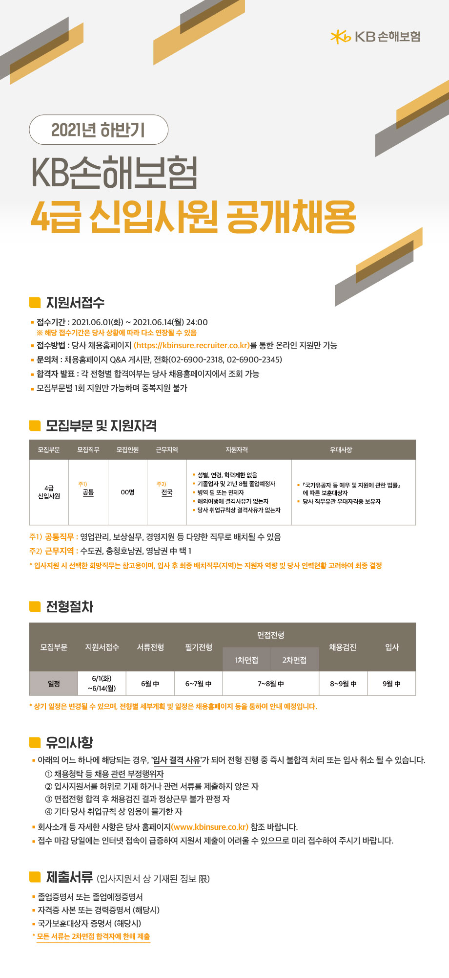 2) 접수방법 : 당사 채용홈페이지 (https://kbinsure.recruiter.co.kr)를 통한 온라인 지원만 가능