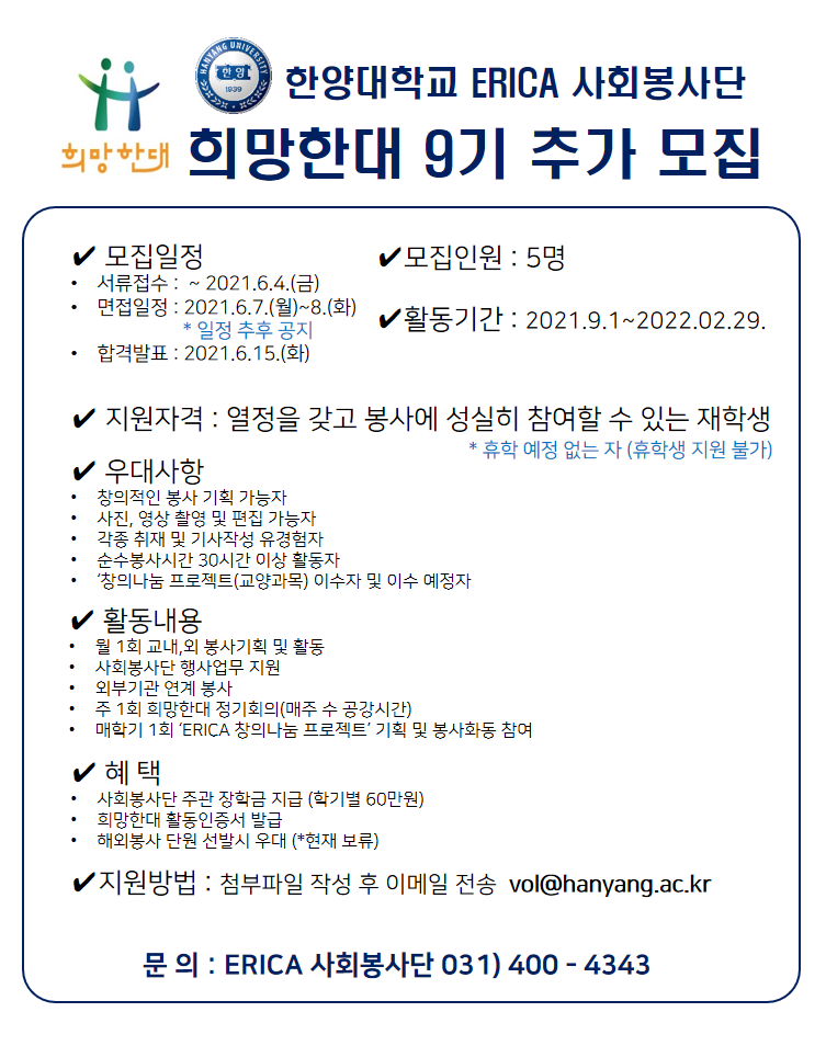 [사회봉사단] 희망한대 9기 추가 모집(~6.4)