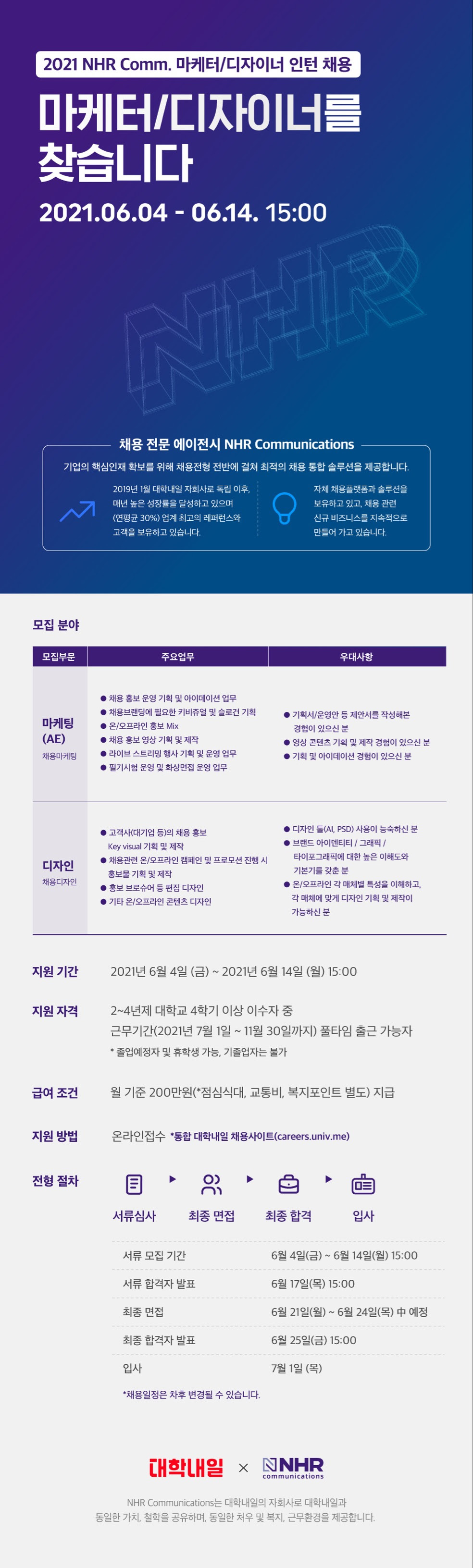 <공고명> : 금번 NHR 인턴 공고는 아래와 같이 진행 중입니다.(1) [NHR커뮤니케이션즈]채용마케팅2팀_디자이너(Design)_모집 (2) [NHR커뮤니케이션즈]채용마케팅3팀_채용마케터(AE)_모집 (2) [NHR커뮤니케이션즈]채용마케팅4팀_디자이너(Design)_모집
