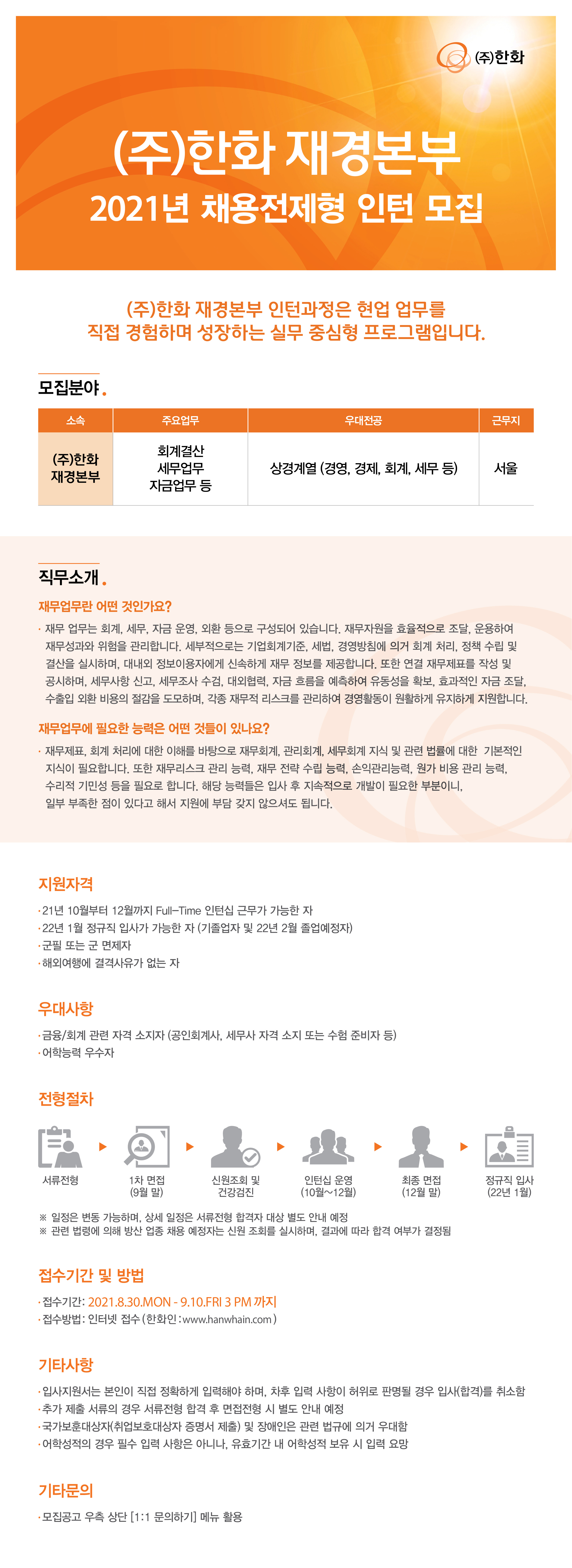 ■지원자격 ·’21년 10월부터 12월까지 Full-Time 인턴십 근무가 가능한 자 ·’22년 1월 정규직 입사가 가능한 자 (기졸업자 및 ’22년 2월 졸업예정자) ·군필 또는 군 면제자 ·해외여행에 결격사유가 없는 자