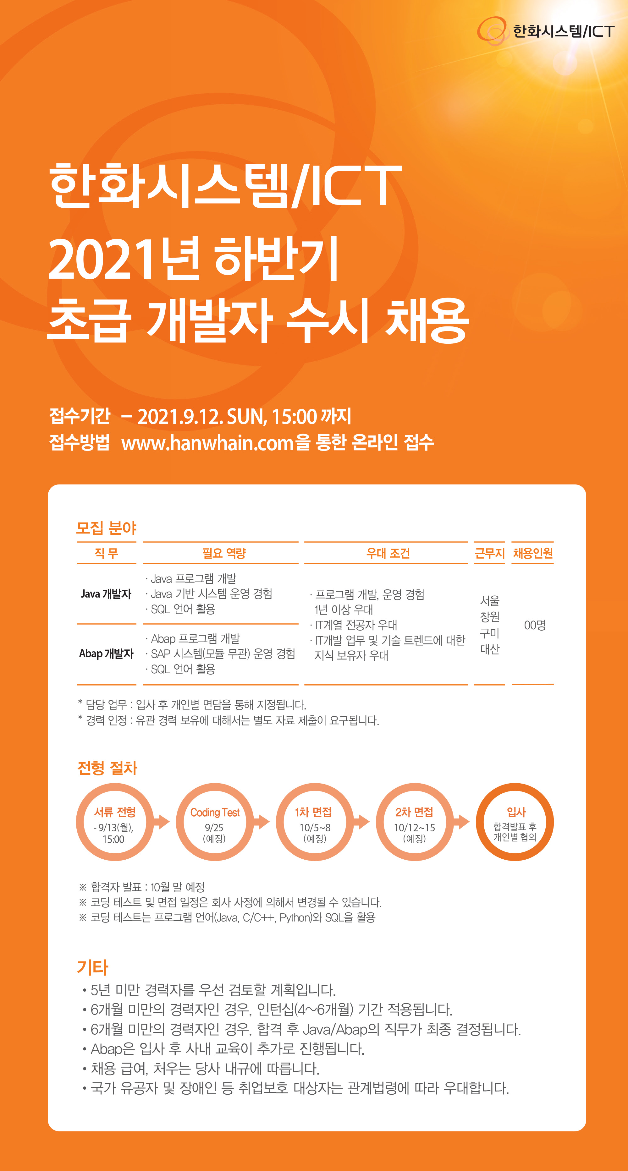 - 6개월 미만의 경력자인 경우, 합격 후 Java/Abap의 직무가 최종 결정됩니다.