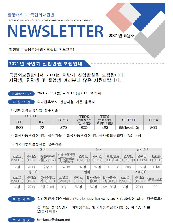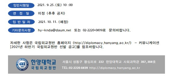 【한양대학교 국립외교원반】 2021년 하반기 국립외교원반 선발 모집(~9.25)10:00