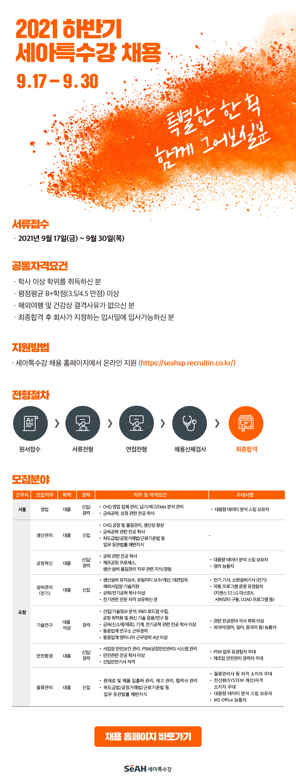 - 지원방법 : 세아특수강 채용 홈페이지에서 온라인 지원(https://seahsp.recruitin.co.kr/)