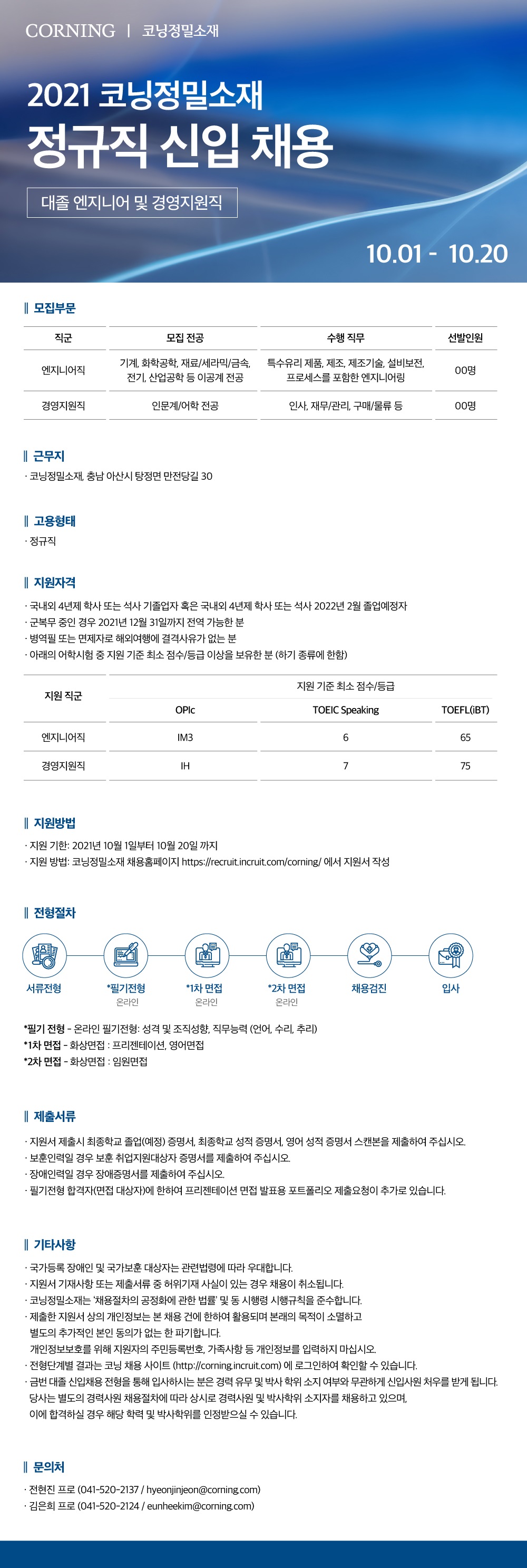 - 지원방법: 코닝정밀소재 채용홈페이지 (https://recruit.incruit.com/corning/)에서 지원서 작성