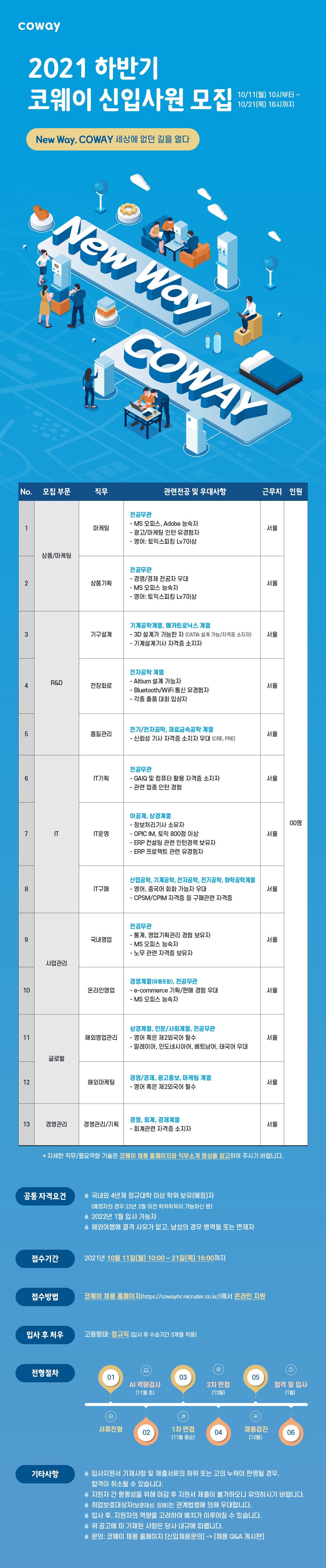 코웨이에서 2021 하반기 신입사원 공개채용을 실시합니다.