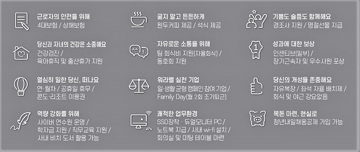더불어 당사는 임직원을 위한 Family day(월 2회 2시간 조기퇴근), 유연근무제(시차출퇴근제·재택근무제), 자유로운 연차사용 등 다양한 직원복지와 복리후생 제도를 제공하고 있습니다.