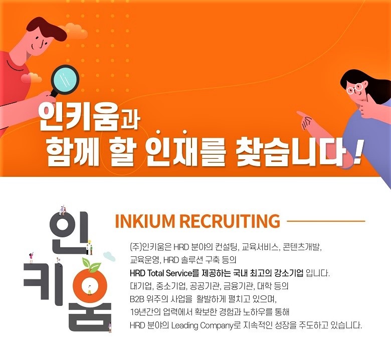 (주)인키움은 인재개발 Total Solution을 제공하는 HRD 교육전문기업입니다.