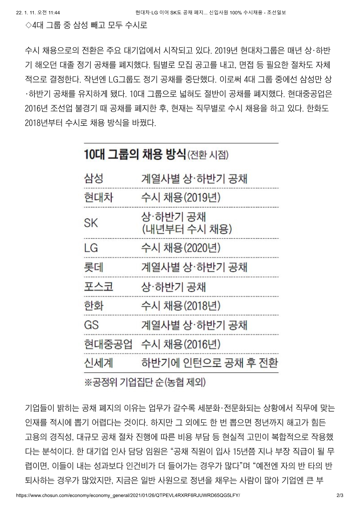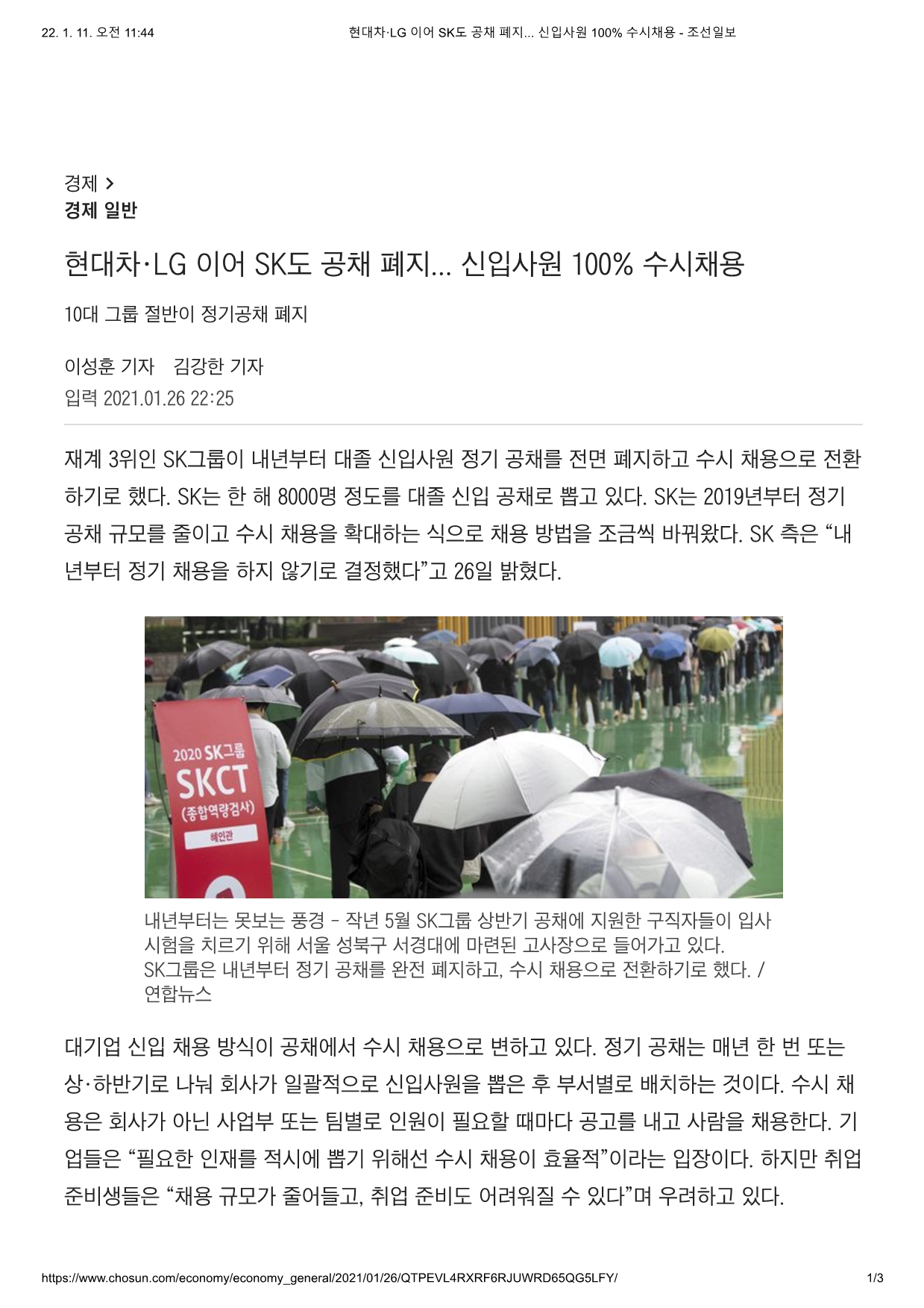 [조선일보] 현대차·LG 이어 SK도 공채 폐지... 신입사원 100% 수시채용