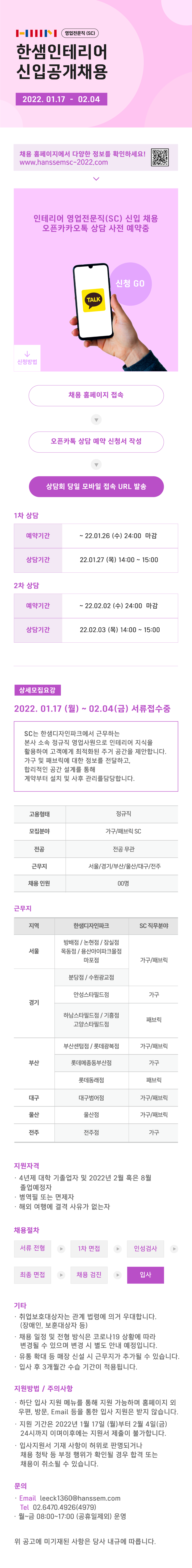 ︎ 오픈카카오톡 채용 상담회 - 오픈 카카오톡에서 한샘 영업전문직 SC에 대한 궁금한 사항을 문의할 수 있습니다.