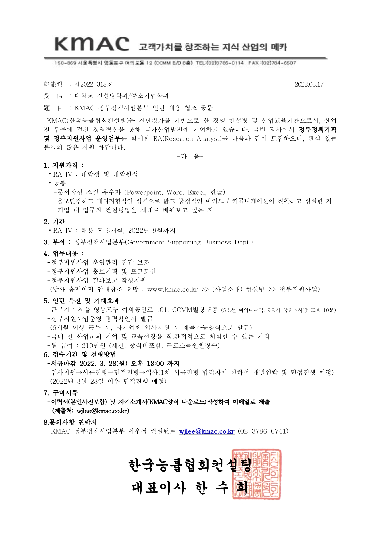 [한국능률협회] KMAC 정부정책사업본부 인턴 채용 (~3.28)