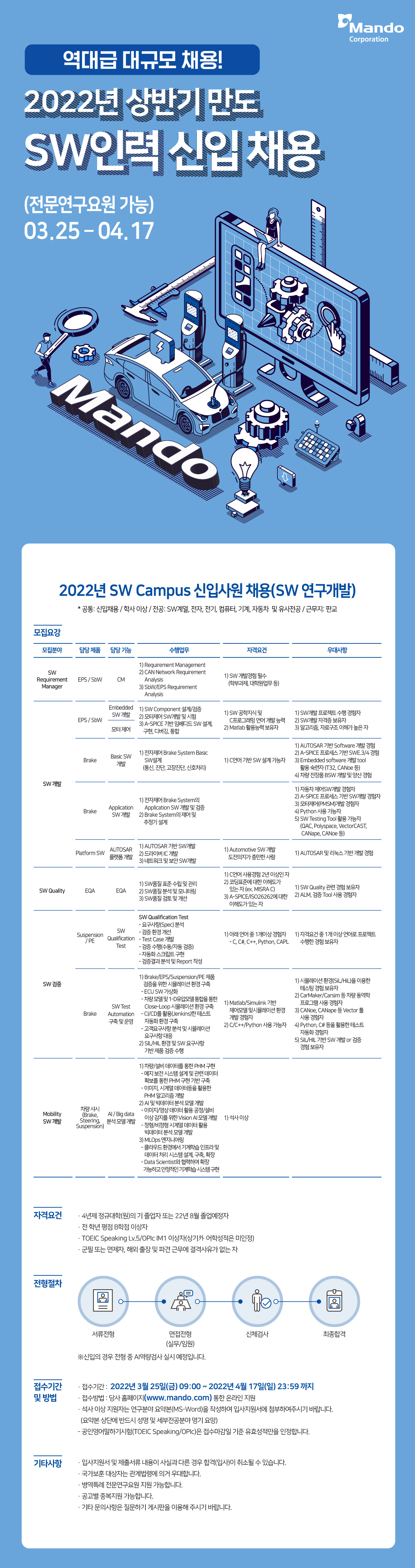 만도의 미래를 이끌어갈 SW Campus 신입사원을 모집합니다.