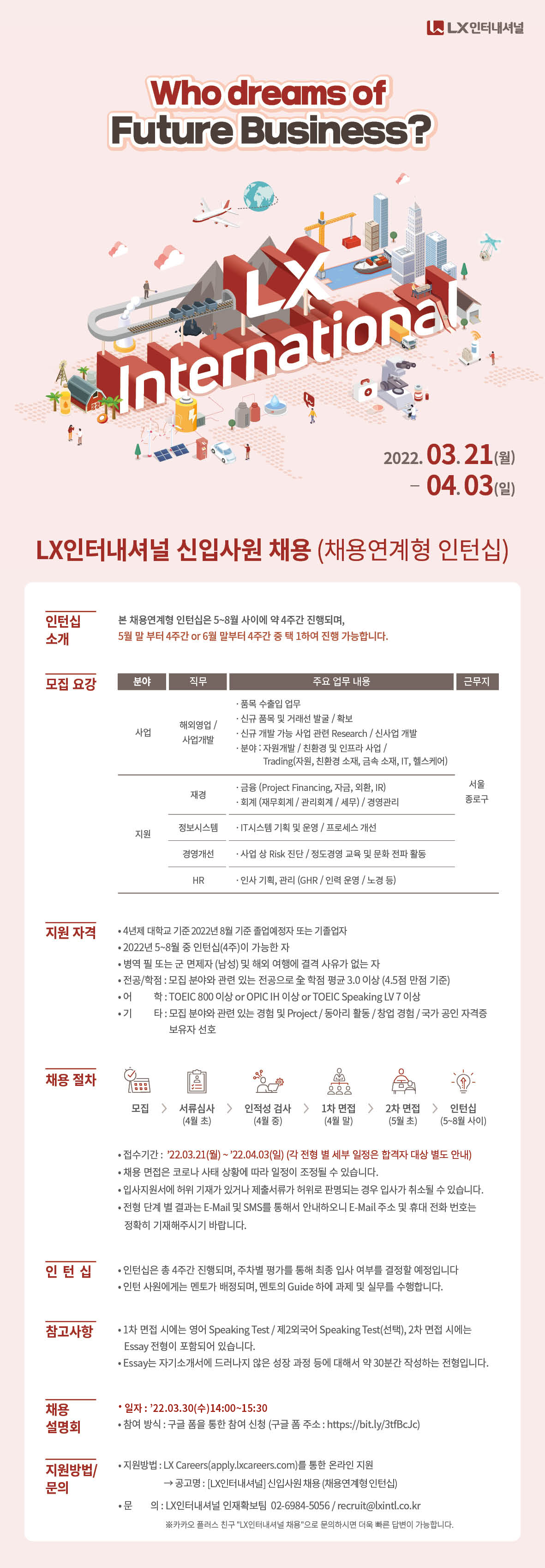 - 모집 > 서류심사(4월 초) > 인적성 검사(4월 중) > 1차 면접(4월 말) > 2차 면접(5월 초) > 인턴십(5~8월 사이)