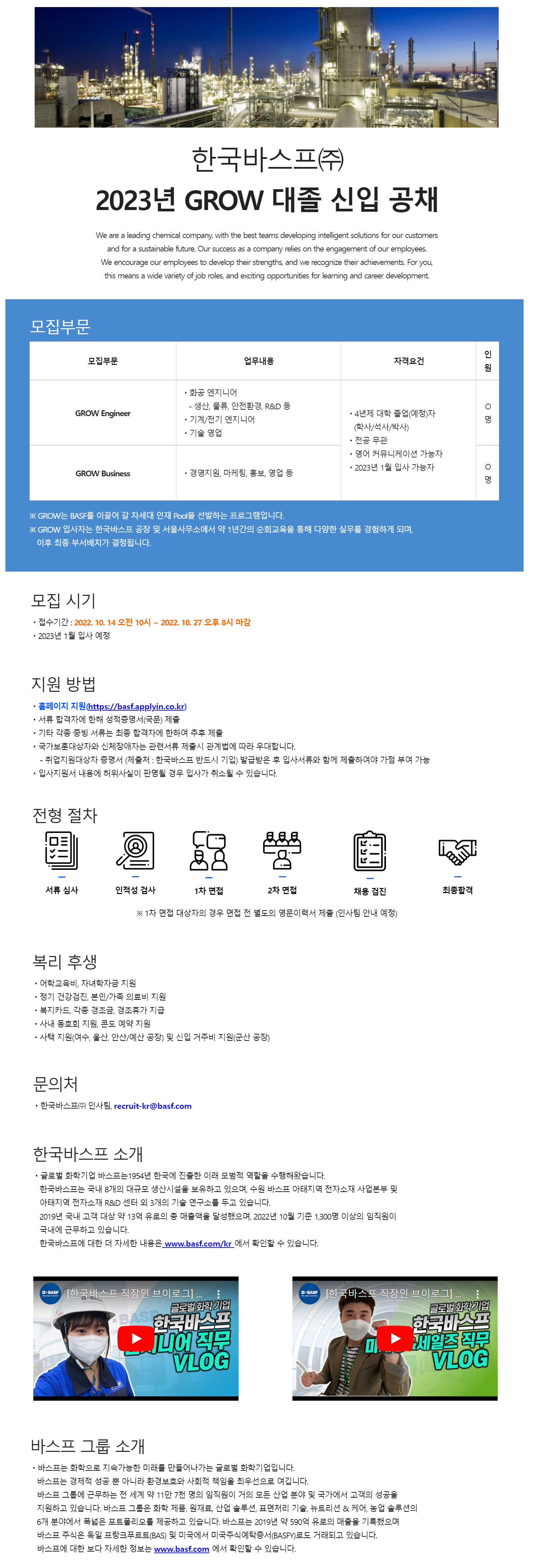 [한국바스프㈜] 2023년 GROW 대졸 신입 공개 채용(~10/27)