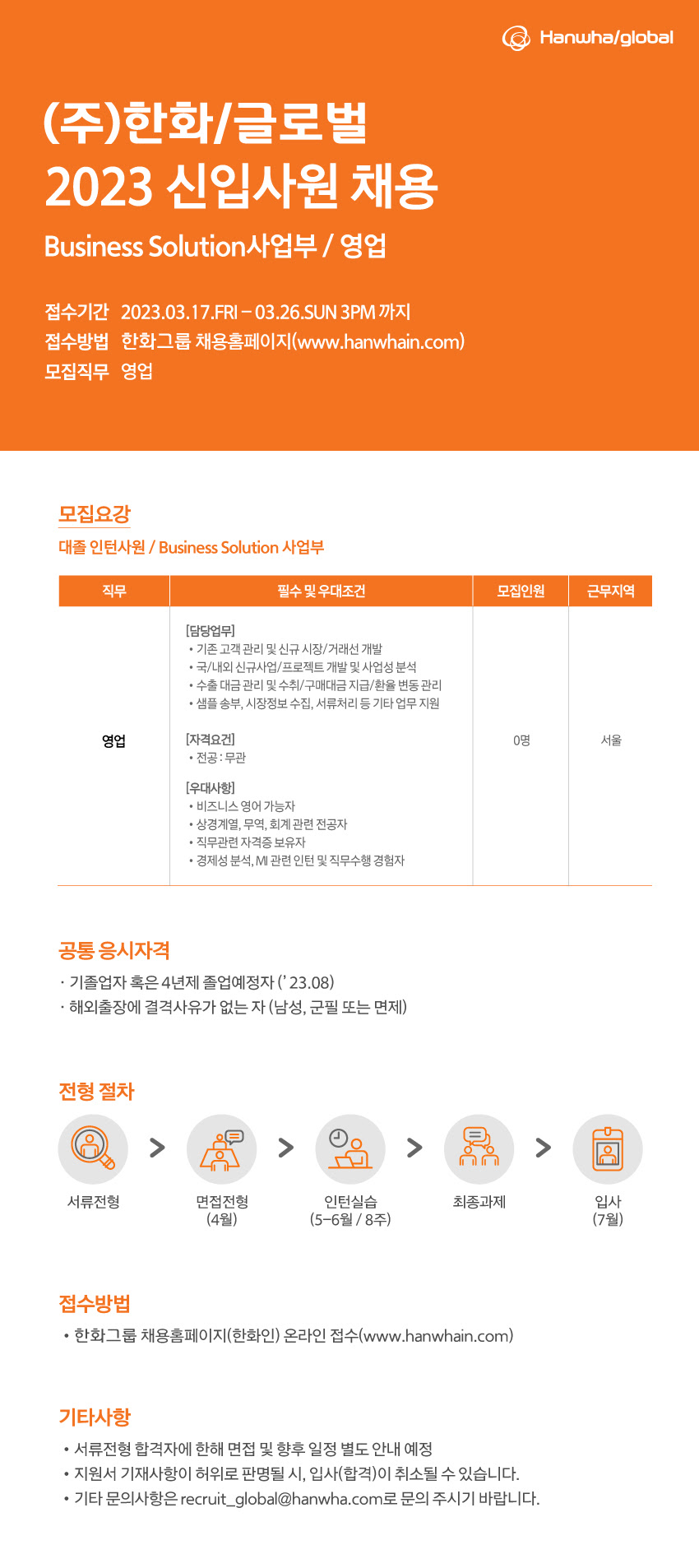 [(주)한화/글로벌] 2023 신입사원 채용 (~3월 26일)