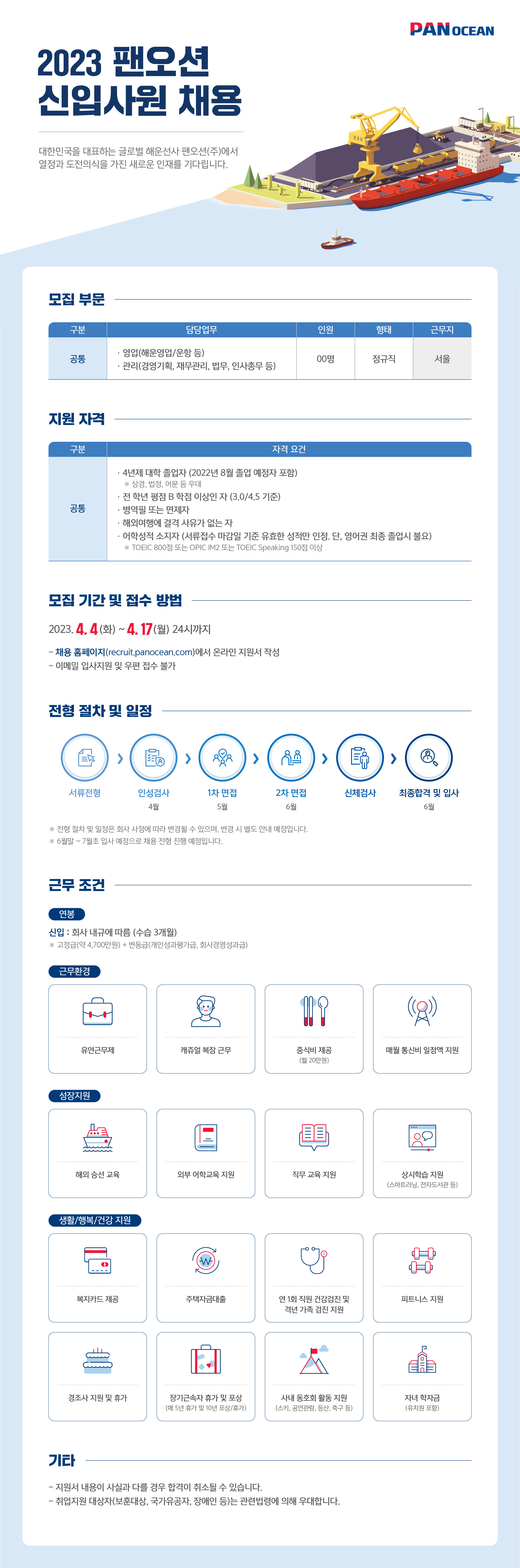 서류전형 → 인성검사(4월) → 1차면접(5월) → 2차면접(6월) → 신체검사 → 최종합격(6월)