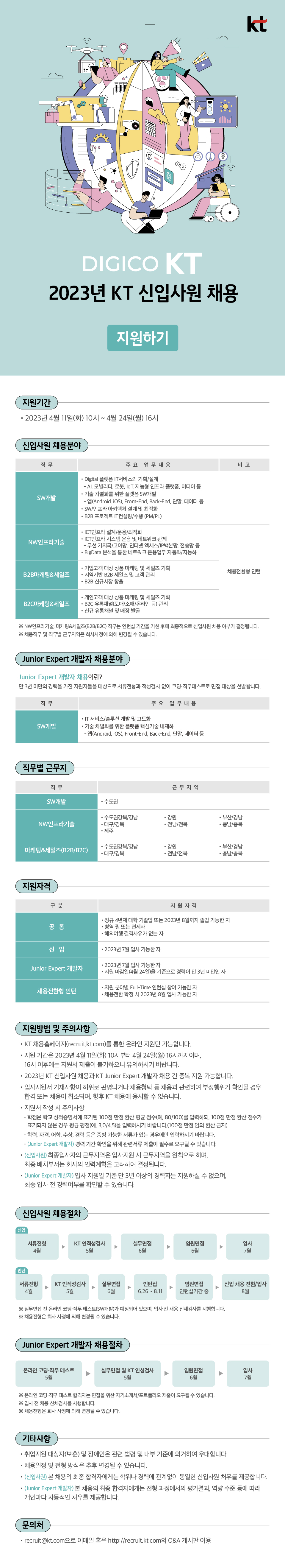 · 2023년 KT 신입사원 채용과 KT Junior Expert 개발자 채용 간 중복 지원 가능합니다.