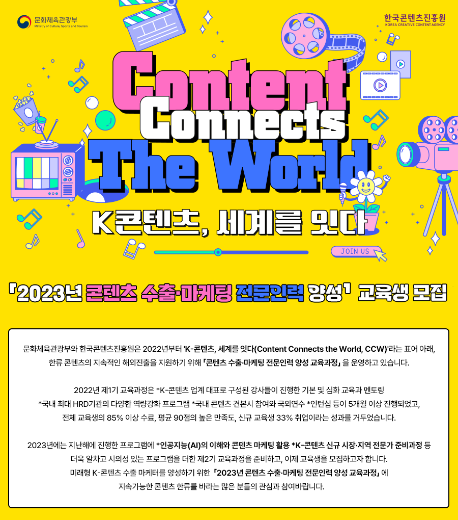 [한국콘텐츠진흥원] 2023년 콘텐츠 수출·마케팅 전문인력 양성 교육생 모집 (~5/7)