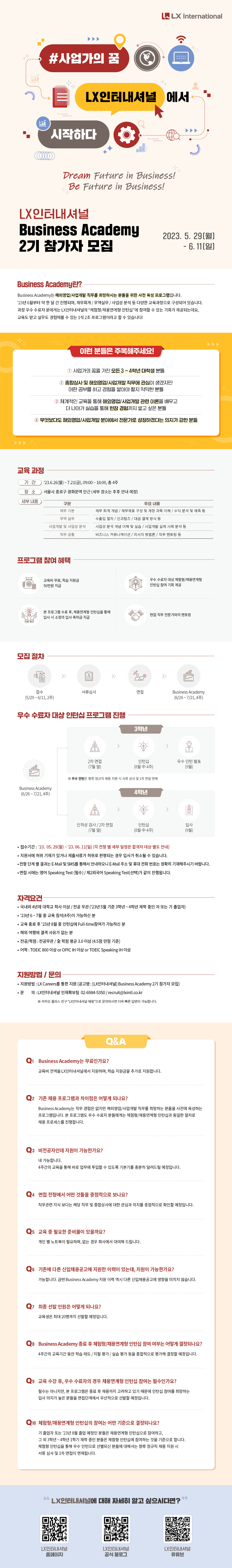 Business Academy는 해외영업/사업개발 직무를 희망하시는 분들을 위한 사전 육성 프로그램입니다. ‘23년 6월부터 약 한 달 간 진행되며, 재무회계 / 무역실무 / 사업성 분석 등 다양한 교육과정으로 구성되어 있습니다. 과정 우수 수료자 분에게는 LX인터내셔널의 “체험형/채용연계형 인턴십”에 참여할 수 있는 기회가 제공되는데요, 교육도 받고 실무도 경험해볼 수 있는 1석 2조 프로그램이라고 할 수 있습니다!