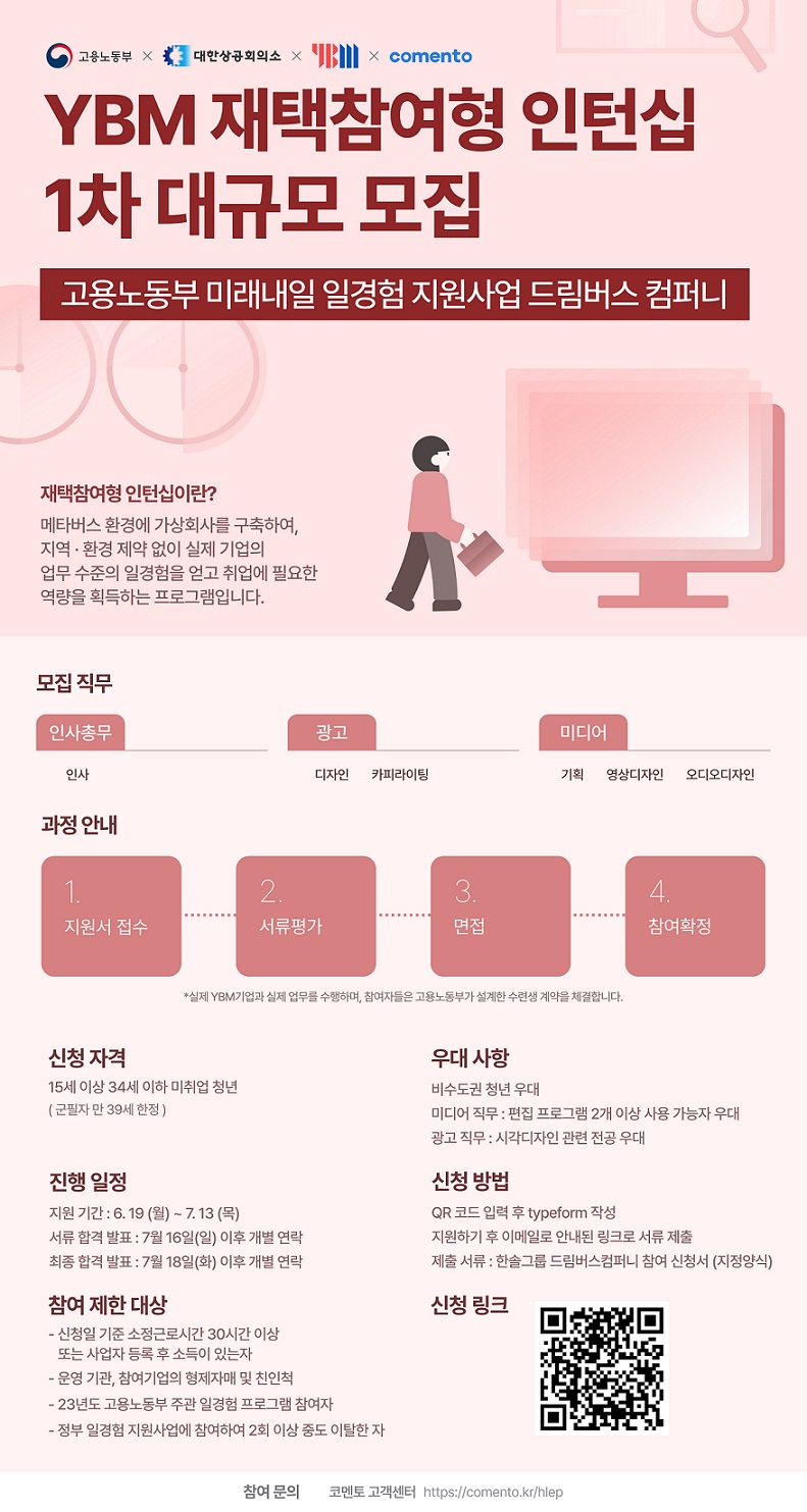 본 프로그램은 고용노동부의 지원으로 전액 무료로 진행되며, 참여자들은 코멘토 메타버스 속 가상회사 '드림버스컴퍼니'로 출근하여 YBM의 현직자와 함께 일경험을 쌓게 됩니다.