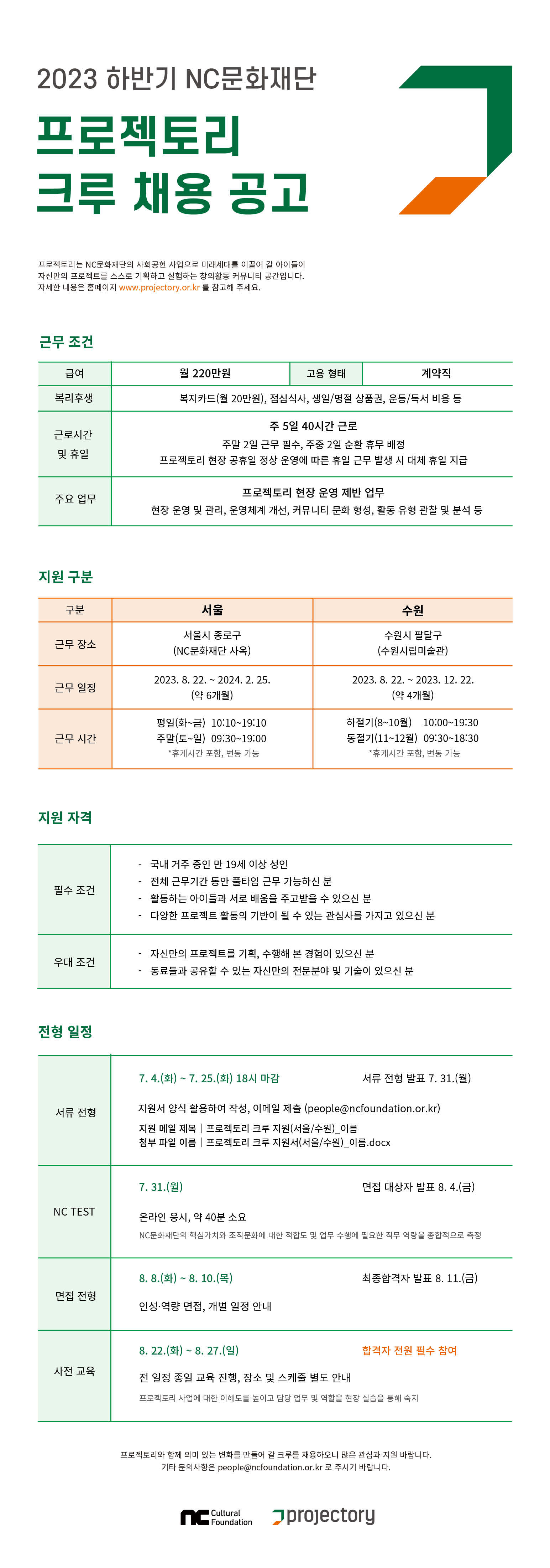 7.4(화)~7.25(화) 18시 마감 지원서 양식 활용하여 작성 후 이메일 제출 (people@ncfoundation.or.kr) ★하단 이미지의 지원 메일 제목과 첨부 파일 이름을 확인 후 제출바랍니다. - NC TEST 7.31(월) / 면접 대상자 발표 8.4(금)
